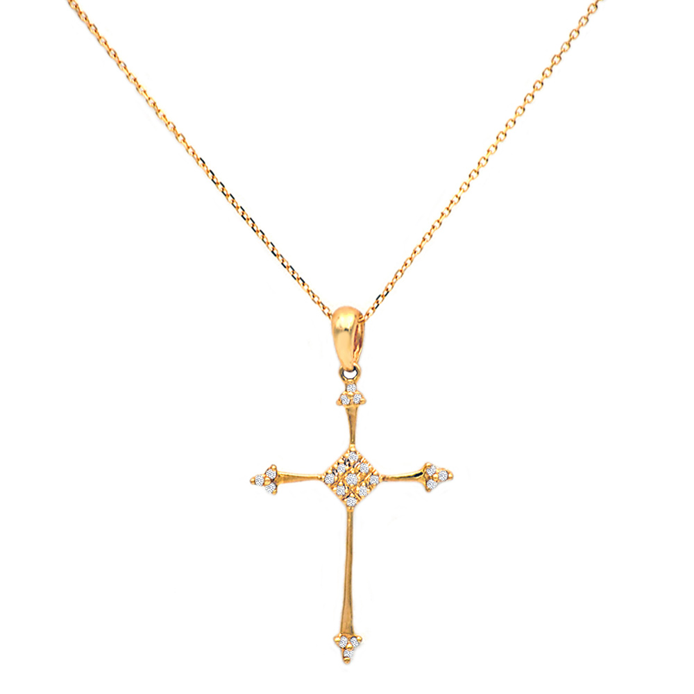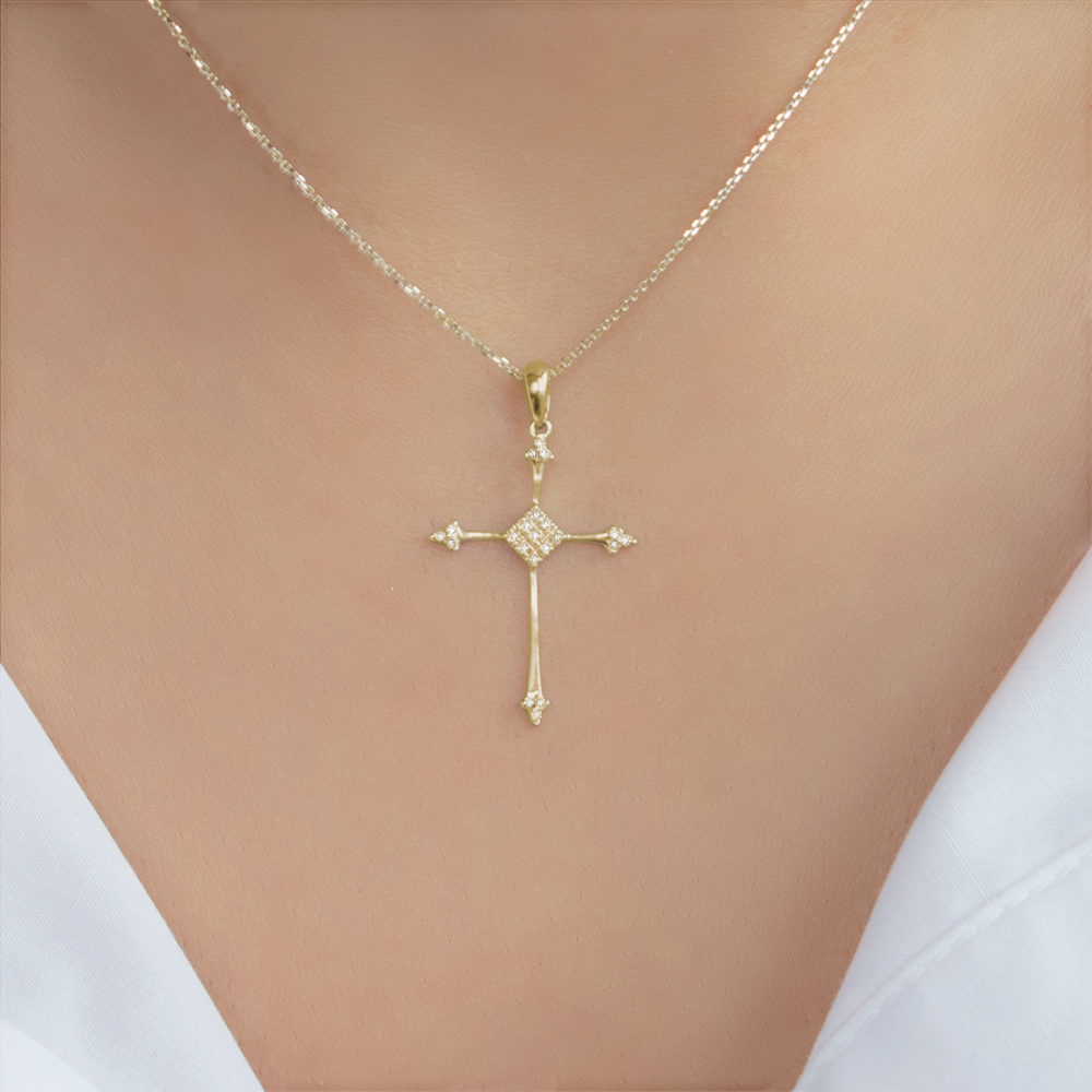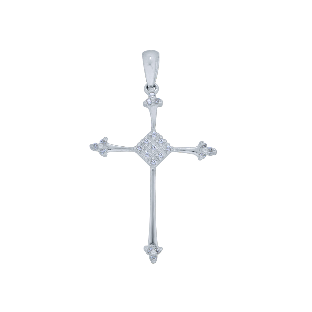 Σταυρός χρυσός ή λευκόχρυσος Κ18 με λουστρέ φινίρισμα. Διαθέτει 21 διαμάντια καθαρότητας VS1 και συνολικού βάρους 0,06ct.