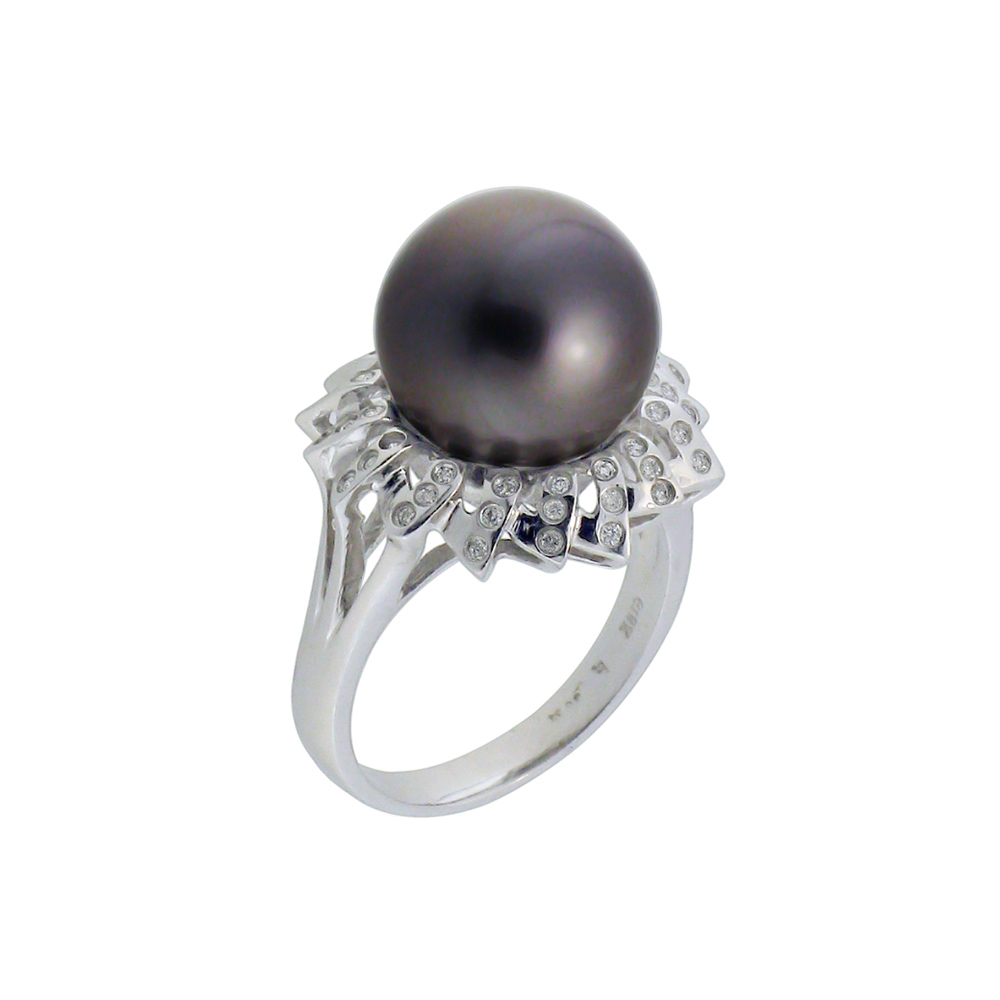 Ένα υπέροχο δαχτυλίδι από 18 καράτια λευκόχρυσου με μαργαριτάρι South Sea Pearl, άριστης ποιότητας διαμέτρου 12.9 χιλιοστών και 48 διαμάντια 0.18 καρατίων.