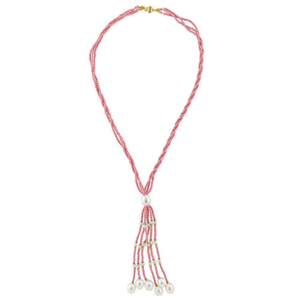 Κολιέ με 3 σειρές ανοιχτόχρωμα κοράλλια 2-2,5 χιλιοστών, 18 λευκά F.W.P. 4 χιλιοστών και 7 λευκά F.W.P. 9,5×11 χιλιοστών, 42 ροδέλες Κ14 και κούμπωμα Κ14.