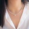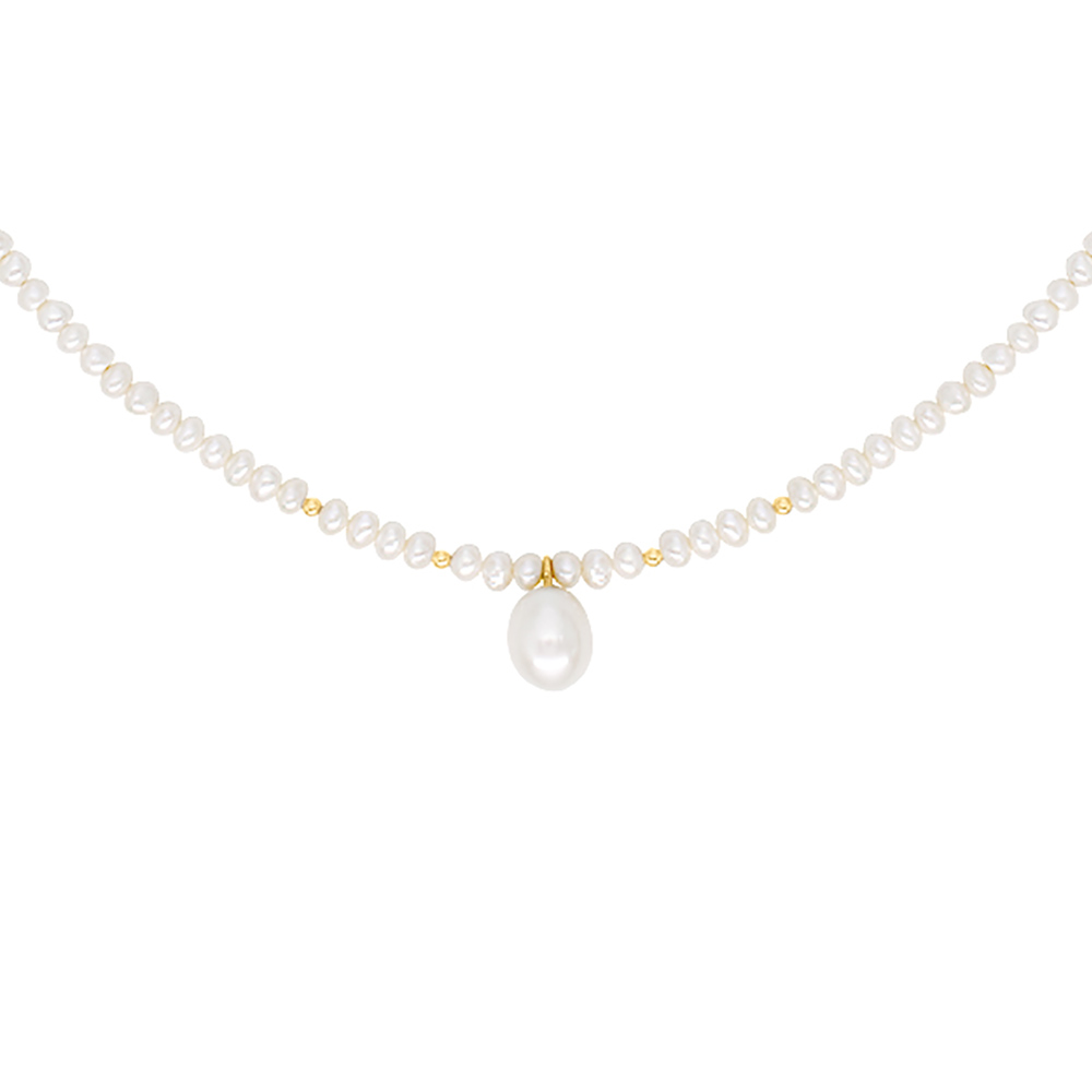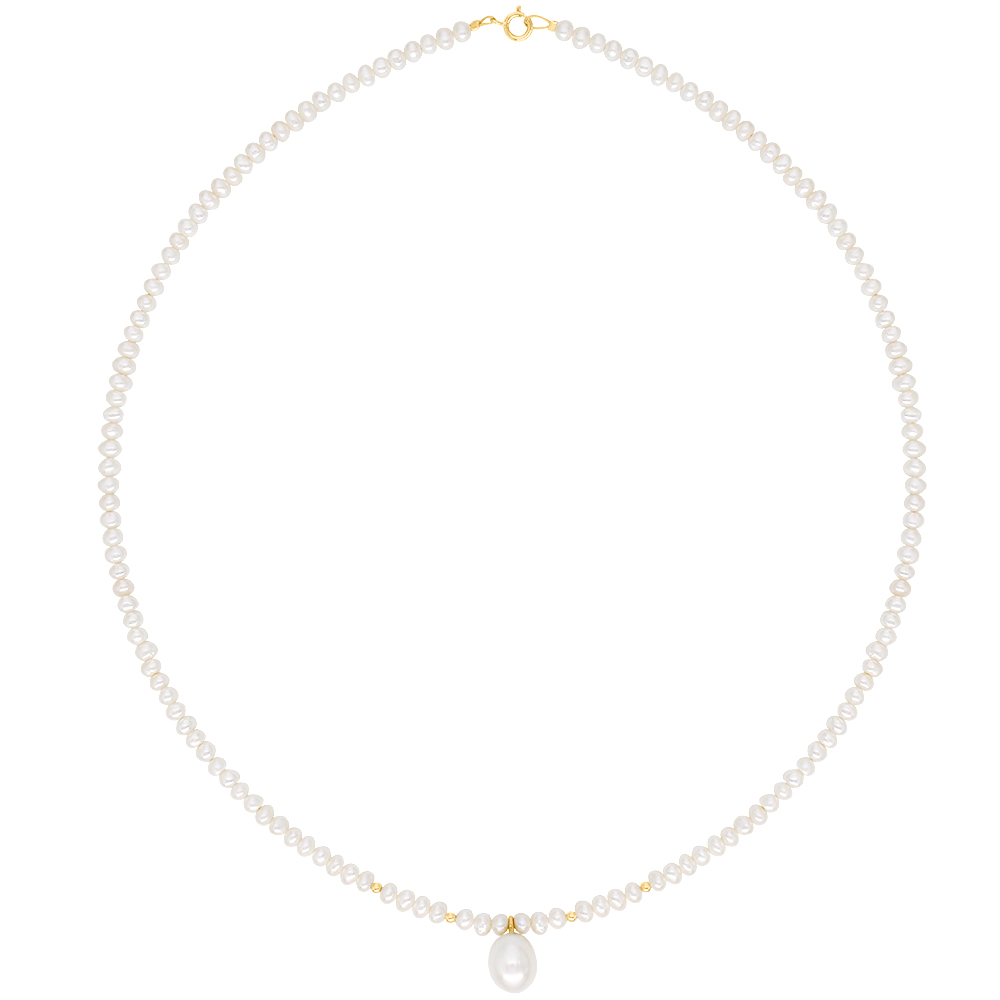 Κολιέ με λευκά μαργαριτάρια Fresh Water Pearl διαμέτρου 3-3,5 χιλιοστών σε σχήμα Round, κούμπωμα Κ14, μενταγιόν- μοτίφ με μαργαριτάρι Fresh Water Pearl 8,5-11 χιλιοστών, σε χρυσό κρίκο Κ14 και Κ14 χρυσές μπίλιες.