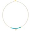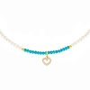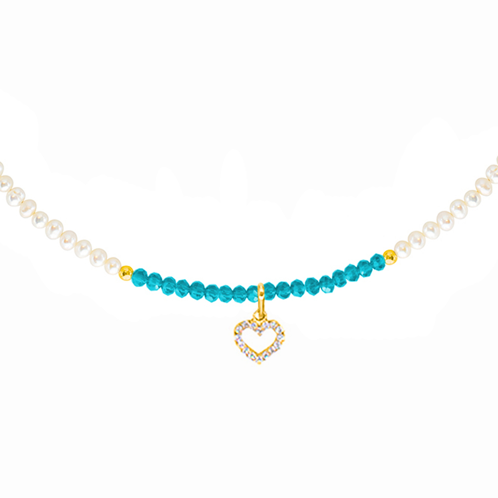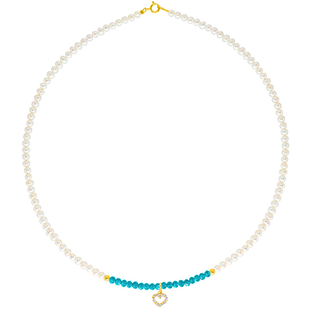 Κολιέ με λευκά μαργαριτάρια Fresh Water Pearl 3,5-4 χιλιοστών.Στο κέντρο του κολιέ υπάρχει ένα μενταγιόν – μοτίφ σε σχήμα καρδιά χρυσό Κ14 το οποίο είναι διακοσμημένο ολόκληρο με ζιργκόν.