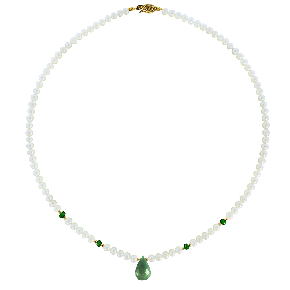 Κολιέ με λευκά Fresh Water Pearl 4-4,5 χιλιοστών, 4 φασεταρισμένα σμαράγδια 3-4 χιλιοστών, ροδέλες Κ14 χρυσές, 1 σμαράγδι 8-13 χιλιοστών και κούμπωμα χρυσό Κ14.