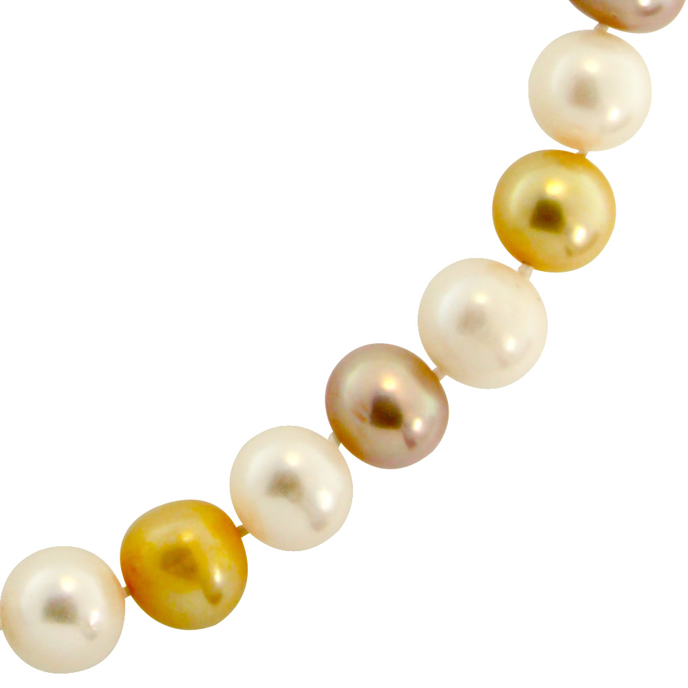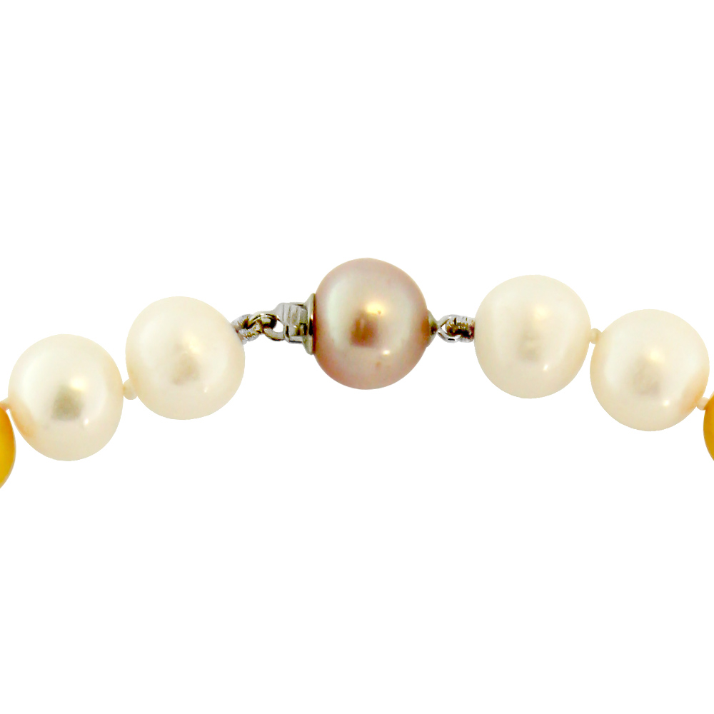 Κολιέ με πολύχρωμα (λευκά, σομόν και Gold) Fresh Water Pearl 10,5-11 χιλιοστών και κούμπωμα με σομόν μαργαριτάρι 10-11 χιλιοστών και λευκόχρυσα Κ18 στοιχεία.