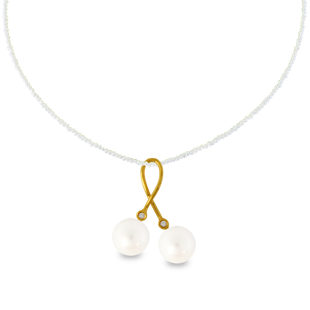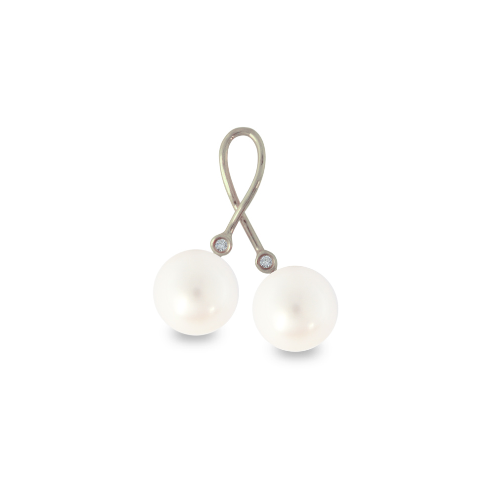 Μενταγιόν με 2 λευκά μαργαριτάρια QTV Akoya Pearl σε σχήμα Round, άριστης ποιότητας διαμέτρου 7,5 – 8,0 χιλιοστών με χρυσή βάση 18 καρατίων στην οποία υπάρχουν 2 διαμάντια 0.02 καρατίων.