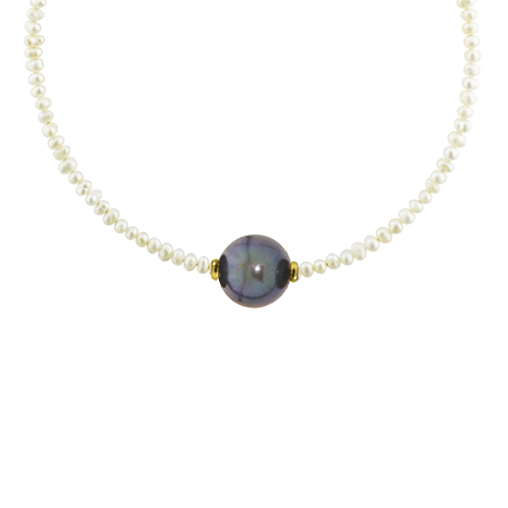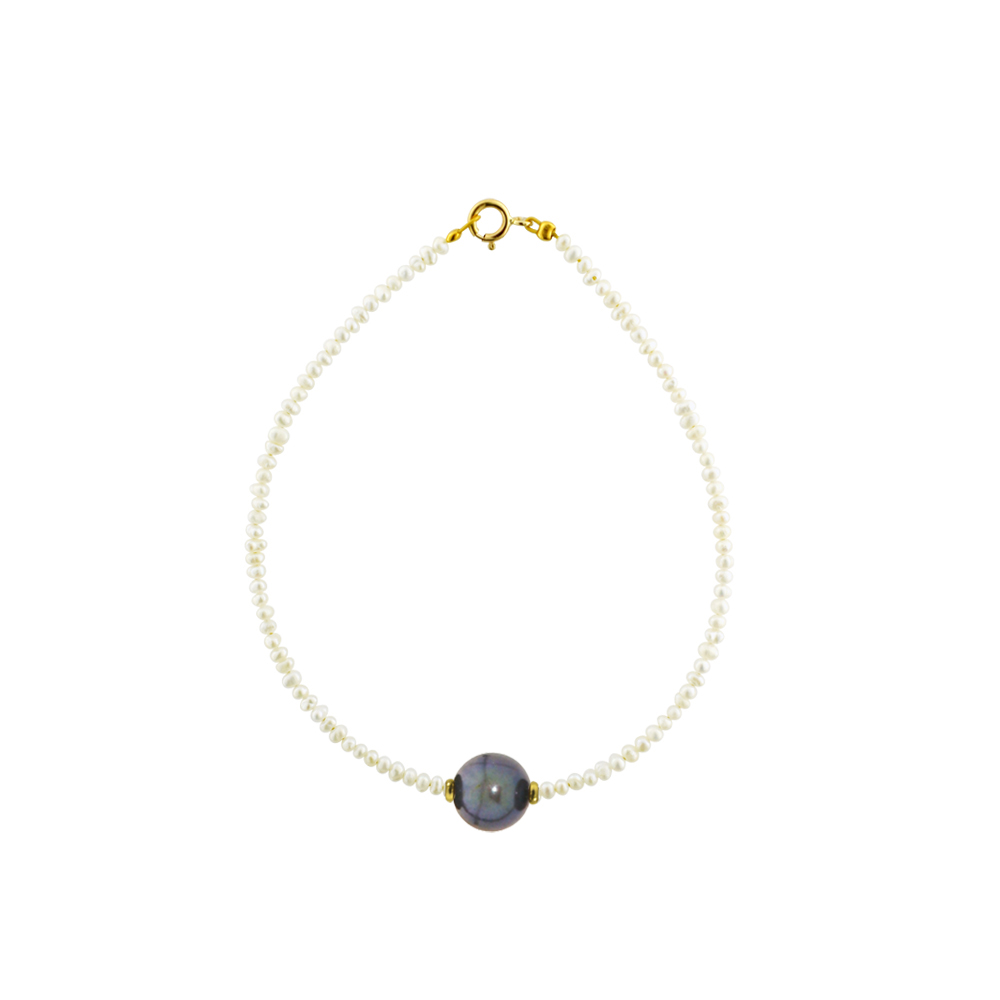 Βραχιόλι με λευκά Fresh Water Pearl 2-3 χιλιοστών, 1 μαύρο F.W.P. 7,5-8 χιλιοστών, 2 ροδέλες Κ14 και κούμπωμα Κ14.