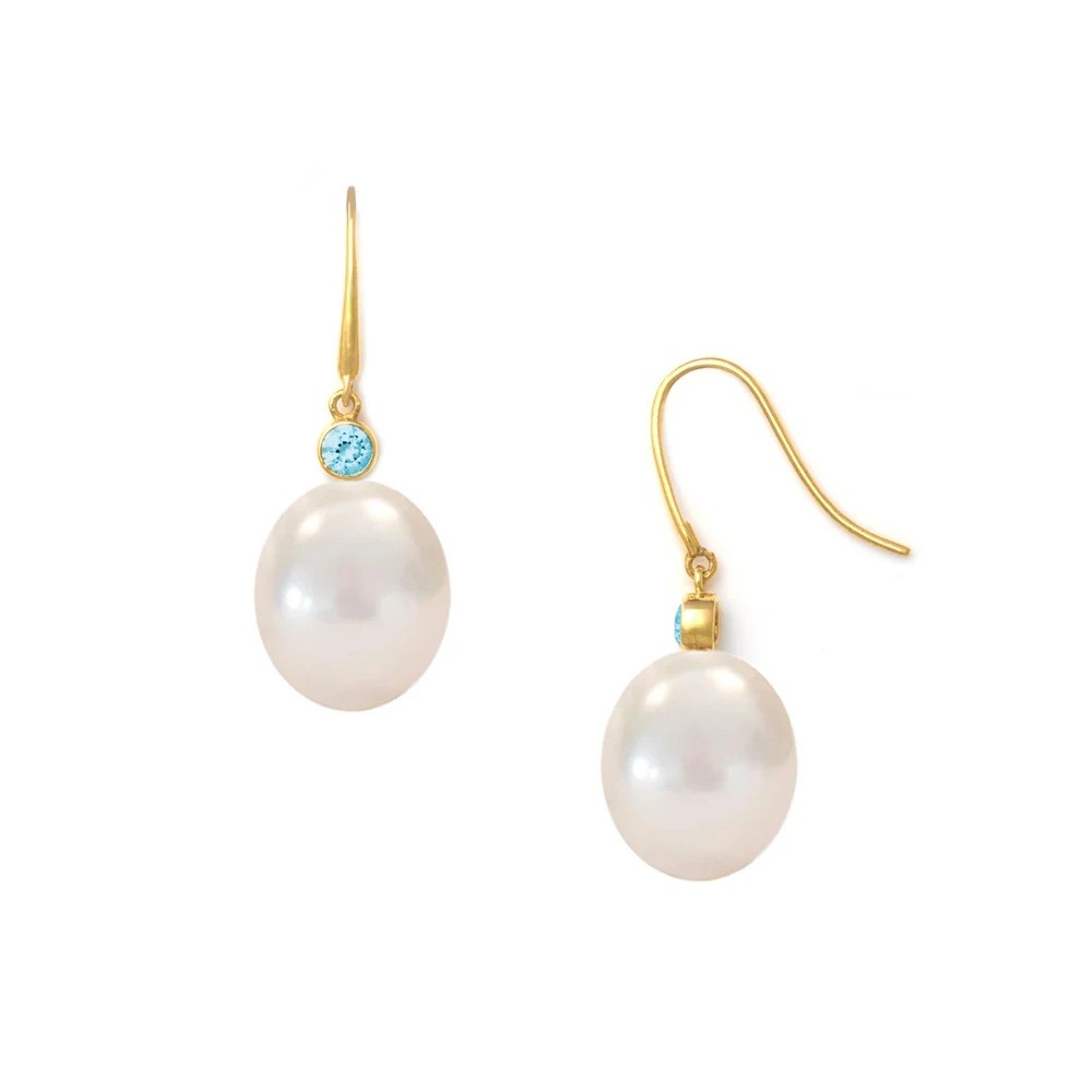 Σκουλαρίκια Κ14 χρυσά με Aqua και λευκά μαργαριτάρια – F124526LB